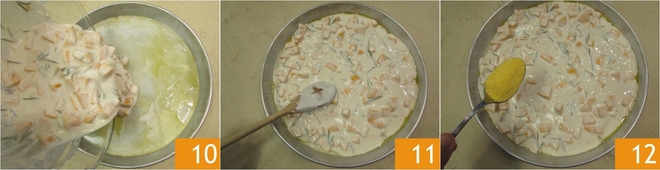 Giet het mengsel erin 10 en strijk het glad met de achterkant van een lepel 11, bestrooi daarna het oppervlak met maïsmeel 12.