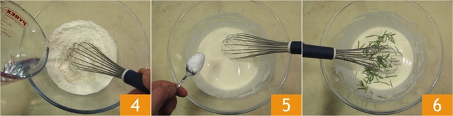 Giet de bloem en het water in een kom en roer met een garde om klontjes te voorkomen 4. Wanneer je een glad en homogeen mengsel hebt, voeg je het zout 5 en de rozemarijnnaalden 6 toe en meng je alles goed door.