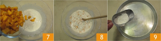 Voeg ook de pompoen toe 7 en verwerk deze met een pollepel door het mengsel 8. Vet en bestuif een bakvorm met een diameter van 28-30 cm 9, verwijder daarna overtollige bloem.