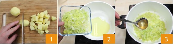 Om de Potage Parmentier te bereiden, schil, was en hak de aardappelen grof 1 en snijd de prei in ringen. Bak de prei een paar minuten in een antiaanbakpan met 3 eetlepels olie 2, voeg dan een lepel bouillon toe en laat ze 5-6 minuten zacht worden 3.