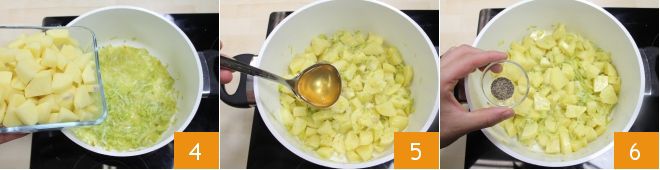 Voeg de aardappelen toe 4 en bedek de groenten met de resterende bouillon 5. Breng op smaak met zout en peper en kook verder op matig vuur totdat de aardappelen zacht zijn (dit duurt ongeveer 15/20 minuten, afhankelijk van het type aardappel).