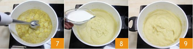Na het koken, pureer alles met een staafmixer 7, voeg de room toe 8 en meng goed om alle ingrediënten te combineren. Laat de soep nog 5 minuten koken, zet dan het vuur uit en serveer de Potage Parmentier terwijl deze nog warm is, eventueel geserveerd met geroosterd brood en geraspte Parmezaanse kaas.