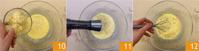 Voeg de geraspte Gruyère toe 10, zout en peper 11 en meng alles goed door elkaar 12.
