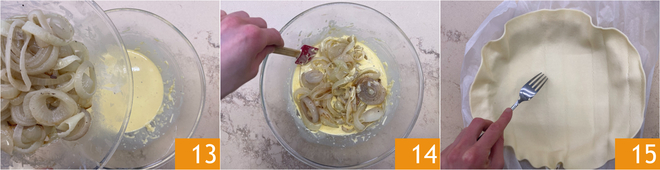 Voeg de lauwe uien toe 13 en roer met een spatel 14. Rol het pâte brisée uit en leg het in een met bakpapier beklede vorm van 22 cm diameter, en prik het deeg in met een vork 15.