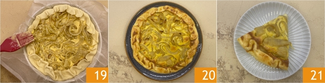 Giet de uienvulling in de vorm 16 en strijk de bovenkant glad 17. Vouw de randen naar binnen 18.