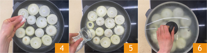 Om de uiquiche te maken, snijd eerst de uien en snijd ze in ringen van ongeveer 1 cm dik 1. Doe in een ruime koekenpan de boter 2 en olie en laat de boter smelten, leg dan de uienringen in de pan 3.