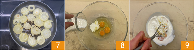 Als de uien zacht zijn, zet je het vuur uit en laat je ze iets afkoelen 7. Doe in een kom de eieren en de room 8 en klop goed met een garde 9.