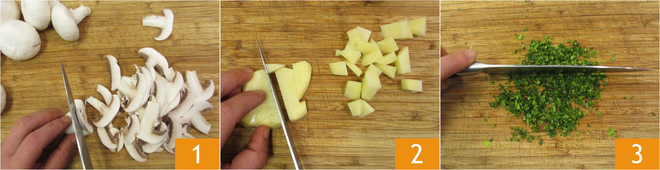 Om de radicchiorolletjes met champignons en Bergkase Superiore te maken, bereid je eerst de ingrediënten voor: maak de champignons schoon en snijd ze in zeer dunne plakjes 1, schil daarna de aardappelen en snijd ze in blokjes van ongeveer 1 cm 2. Hak tot slot de peterselie fijn 3.