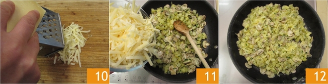 Rasp ondertussen de Bergkase Superiore met een grove rasp 10. Strooi de geraspte kaas over de inmiddels lauwe vulling 11, meng goed en zet apart 12.