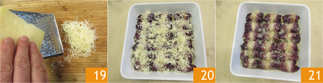 Je bent klaar om de rolletjes te maken: leg de radicchiobladeren op een snijplank en voeg een eetlepel vulling toe 16, vouw dan de zijkanten licht naar binnen en rol het blad voorzichtig op 17. Leg de zo verkregen rolletjes in een ingevette ovenschaal 18.