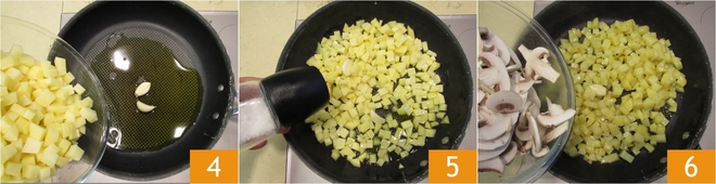 Verhit in een koekenpan de knoflook met de olie een paar minuten, voeg dan de aardappelen toe 4, zout 5 en bak minstens 7-8 minuten. Voeg op dat punt de champignons toe 6 en bak nog 4-5 minuten.