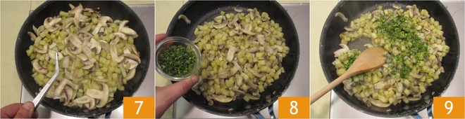 Wanneer de vulling gaar is, verwijder je de knoflook 7 en voeg je de fijngehakte peterselie toe 8; zet vervolgens het vuur uit en laat licht afkoelen 9.
