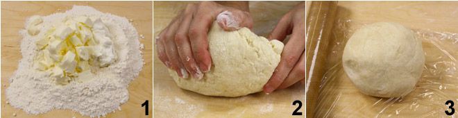 Om de ricotta-driehoekjes met kersenjam en Nutella te bereiden, begin je met het maken van het deeg: leg de bloem, de in stukjes gesneden (koude) boter en de ricotta op een werkblad 1 en kneed de ingrediënten goed tot je een glad en elastisch deeg hebt 2. Als het mengsel tijdens deze bewerking aan het werkblad blijft plakken, bestrooi het dan meerdere keren met bloem totdat het deeg elastisch en droog is. Wikkel het deeg op dit punt in plasticfolie en zet het minstens een half uur in de koelkast 3.