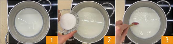 Om de rijstbeignets van Sint-Jozef te maken, verwarm je eerst de melk in een steelpan 1. Zodra het kookt, voeg je de suiker toe 2 en roer je zodat de suiker helemaal oplost 3.