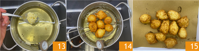 Je bent klaar om te frituren: verwarm de zonnebloem- of andere neutrale olie tot een temperatuur van 170 °C, schep vervolgens hoopjes van ongeveer 25-30 g per keer in de olie 13. Frituur ze ongeveer 2 minuten tot ze goudbruin zijn, draai ze af en toe om 14, en laat ze uitlekken op frituurpapier 15. Bak niet te veel beignets tegelijk om te voorkomen dat de temperatuur van de olie te veel daalt.