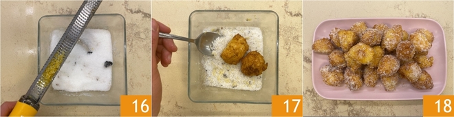 Intussen kun je de suiker om te bestrooien op smaak brengen met de zaadjes van de vanillestok en de geraspte citroenschil 16. Haal de beignets terwijl ze nog warm zijn door de gearomatiseerde suiker zodat ze volledig bedekt worden 17. Je rijstbeignets van Sint-Jozef zijn klaar om geserveerd te worden 18!