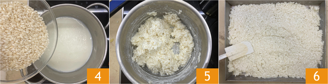 Voeg nu de rijst toe 4, roer en kook op middellaag vuur gedurende ongeveer 30-45 minuten. Roer af en toe zodat het niet aanbrandt. Aan het einde van de kooktijd moet de rijst alle melk hebben opgenomen 5. Doe de gekookte rijst in een lage, brede schaal en strijk hem glad zodat hij sneller afkoelt 6.