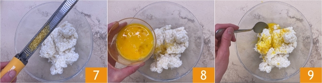 Zodra hij koud is, doe je de rijst in een kom en voeg je de geraspte citroenschil toe 7, het ei 8 en het bakpoeder 9. Roer met een lepel.