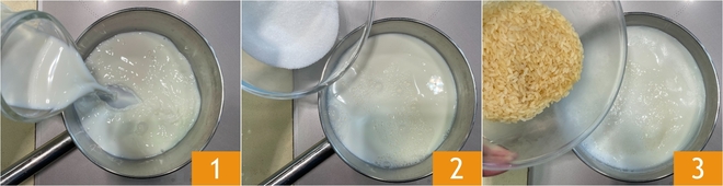 Om de risolatte met rood fruit te bereiden, giet je de melk 1 en de suiker 2 in een steelpannetje, roer en breng aan de rand van het kookpunt. Voeg op dat moment de rijst toe 3.