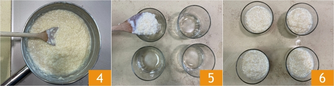 Blijf op laag vuur roerend koken gedurende ongeveer 30 minuten, totdat de rijst alle melk heeft opgenomen: je moet een romige consistentie verkrijgen 4. Verdeel het mengsel over 4 glaasjes van 190 ml elk 5 en zet ze in de koelkast om op te stijven 6.