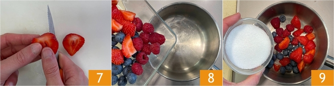 Maak intussen de saus met rood fruit: was de aardbeien en snijd ze in stukjes naar wens qua grootte 7. Doe de aardbeien, bosbessen en frambozen in een steelpannetje 8 samen met de suiker 9.