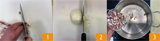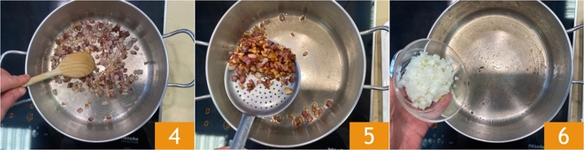 Bak deze op hoog vuur 4 tot hij goudbruin is 5 en leg hem daarna op keukenpapier zodat overtollig vet kan verdwijnen. Gebruik in dezelfde pan het vet van de pancetta om de gesnipperde ui een paar minuten te fruiten tot hij zacht is 6.