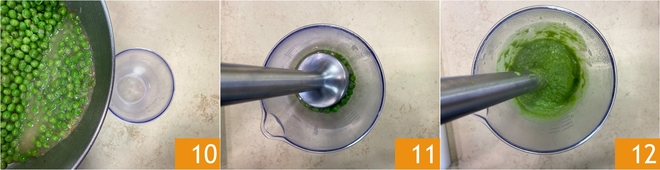 Wanneer ze gaar zijn, doe de helft in een hoge beker 10 en pureer met de staafmixer 11 tot een gladde crème 12. Houd de overige doperwten apart voor de uiteindelijke garnering.