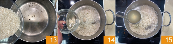 Ga nu verder met de rijst: toast de Carnaroli in dezelfde pan, zonder extra vet toe te voegen, een paar minuten 13, blus af met witte wijn 14 en laat de alcohol verdampen. Begin geleidelijk de bouillon te schenken 15 en roer regelmatig.