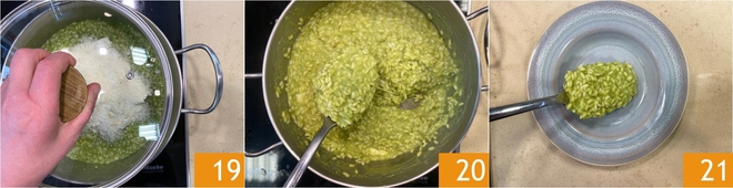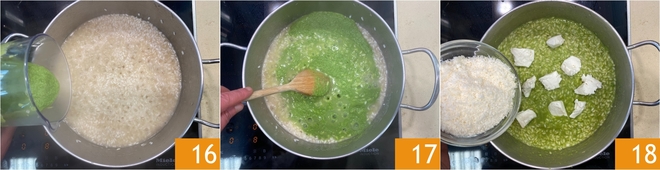 Halverwege de gaartijd voeg je de doperwtencrème toe 16 en ga je door tot de korrel al dente is 17. Zodra je het vuur uitzet, maak je het romig met boter en Parmezaan 18.