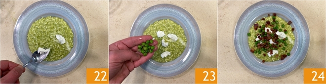 Garneer met toefjes crescenza 22, de hele doperwten die je apart hebt gehouden 23 en de krokante pancetta. De risotto met doperwten, crescenza en krokante pancetta is klaar om te proeven 24.