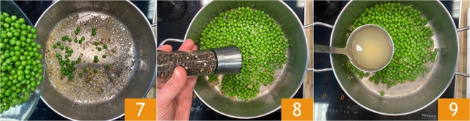 Voeg nu de doperwten toe 7 en laat ze ongeveer zeven minuten garen met een snufje zout, peper 8 en een pollepel groentebouillon 9.