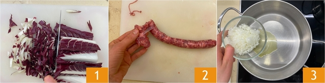 Om de risotto met radicchio en worst te bereiden snijd je de radicchio in reepjes 1, verwijder je het vel van de worst en verkruimel je het vlees 2. Doe de extra vergine olijfolie in een pan, voeg de fijngesnipperde ui toe en laat deze zachtjes slinken op laag vuur 3.