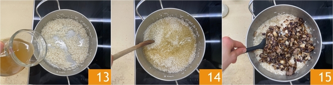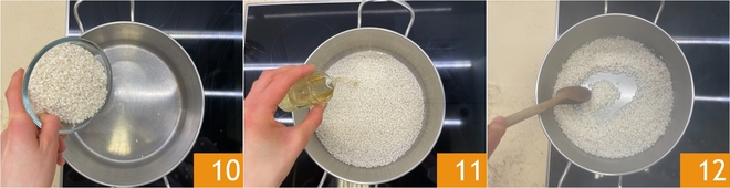 Doe de carnaroli-rijst in een pan en rooster de korrels kort 10. Zodra de korrels goed heet zijn, blus je af met witte wijn 11. Laat de alcohol verdampen op middelhoog-hoog vuur 12.