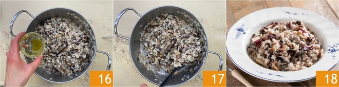 Maak het geheel romig af met extra vergine olijfolie 16. Breng op smaak met zout en peper, roer nog één keer goed door met een spatel 17 en je risotto met radicchio en worst is klaar om van te genieten 18!