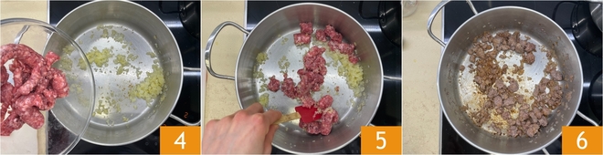 Na ongeveer 3 minuten voeg je de worst zonder vel toe 4. Houd de temperatuur middelhoog en roer vaak met een spatel 5. Blijf ongeveer 7 minuten bakken of totdat de worst mooi goudbruin is 6.