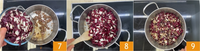 Op dit punt kun je de radicchio in reepjes toevoegen 7. Meng goed met een lepel 8, laat nog 3 minuten doorgaren en zet het mengsel vervolgens even apart 9.