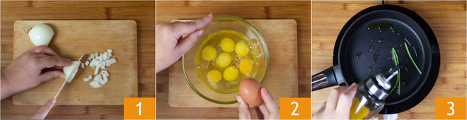 Om roerei met tomaat te bereiden, snijd eerst de ui fijn 1 en breek de eieren in een kom 2. Doe wat peterseliestengels in een koekenpan, giet de olie erin 3 en verhit 2 minuten.