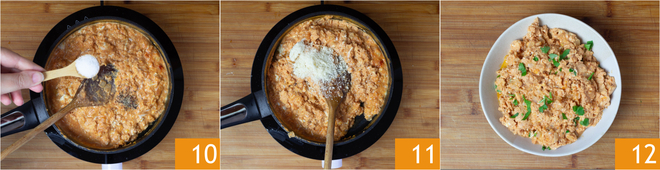 Breng op smaak met zout en peper 10. Voeg tenslotte geraspte Parmezaanse kaas toe 11 en schep nog een paar minuten door. Schep op borden en werk af met fijngehakte verse peterselie. Roerei met tomaat is klaar om van te genieten 12.