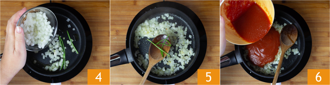 Voeg de ui toe 4 en bak deze op hoog vuur 3 minuten. Verwijder de peterseliestengels 5 en voeg de tomatenpassata toe 6. Laat op laag vuur 10-12 minuten sudderen.