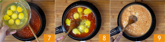 Giet de eieren in de pan 7 en roer zodat de dooiers worden gebroken 8. Bak ongeveer 10 minuten, af en toe roerend 9.
