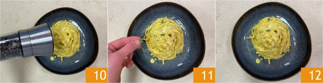 Maak af met versgemalen peper 10 en een paar blaadjes salie 11. Je romige ricotta-saffraanpasta is klaar om geserveerd te worden 12!