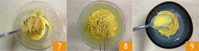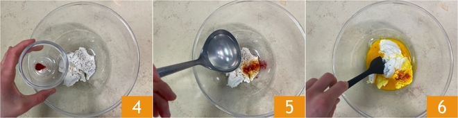 Voeg de saffraan toe 4 en een soeplepel van het kookwater van de pasta 5, roer vervolgens alles door 6 totdat je een zachte en egale crème krijgt.