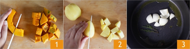 Om de pompoen- en aardappelsoep te maken, bereid je eerst de Groentebouillon en houd je deze warm. Maak de pompoen schoon en snijd het vruchtvlees grof in blokjes 1, doe hetzelfde met de aardappelen 2 en de ui. Verhit een scheut olijfolie in een pan met takjes tijm, voeg dan de ui toe en fruit deze een paar minuten 3.