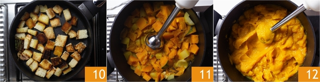 Rooster de croutons en schep ze vaak om; ze moeten knapperig en goudbruin zijn 10. Pureer ondertussen de pompoen en de aardappelen in de pan met een staafmixer 11 tot een gladde en egale textuur 12; indien nodig kun je de crème met een beetje bouillon verdunnen.