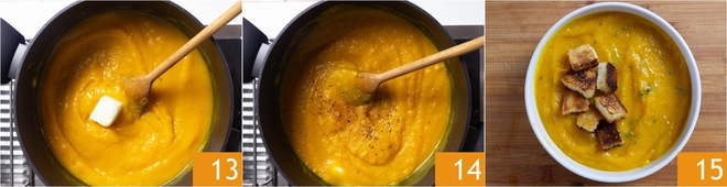 Zet het vuur weer aan en voeg de boter toe, roer om te laten smelten 13. Breng tenslotte op smaak met zout, peper en nootmuskaat 14. Serveer je pompoen- en aardappelsoep gegarneerd met de croutons 15!