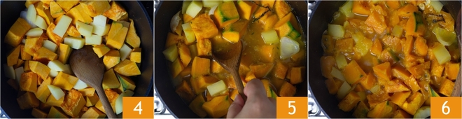 Voeg de pompoen en de aardappelen toe, bak ze een minuutje aan 4, giet daarna de warme bouillon erop 5. Zet het vuur laag en laat met de deksel op de pan ongeveer 15-20 minuten zachtjes koken. Wanneer de pompoen en de aardappelen zacht zijn, zet je het vuur uit en laat je het iets afkoelen 6.