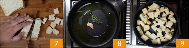 Snijd intussen het witbrood in blokjes om de croutons te maken 7. Verhit de olie in een pan met een teentje knoflook in de schil en de tijm 8, voeg dan de broodblokjes toe 9.