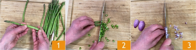 Om de romige tubetti met doperwten, asperges en pecorino te bereiden, begin je met het Hoe asperges schoonmaken: verwijder het harde uiteinde van de steel 1 en snijd de rest in ringetjes 2, houd de toppen iets langer. Maak de sjalot schoon en hak deze fijn 3. Verwarm ondertussen water of groentebouillon.