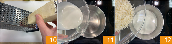 Maak ondertussen de fondue. Rasp eerst de pecorino 10. Doe in een steelpannetje de verse room 10 en voeg de geraspte pecorino toe 12.