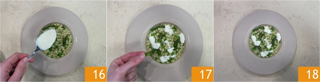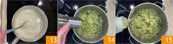 Laat op zeer laag vuur smelten 13, af en toe roeren, tot je een gladde en egale crème krijgt. Wanneer de tubetti gaar en romig zijn, zet je het vuur uit. Voeg een draai versgemalen zwarte peper toe 14 en maak het geheel af door de pasta te mengen met een scheut extra vierge olijfolie 15.